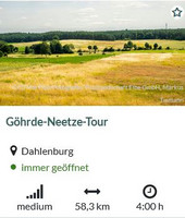 In Dahlenburg am Marktplatz geht es los. Besuchen Sie das Heimatmuseum. Weiter über Ellringen, vorbei an großen Pferdeherden nach Neetze. Durch das bezaubernde Neetzetal Richtung Bleckede. Der Findlingsgarten Breetze bei Bleckede liegt an der Strecke, die dann über Bleckede (Biosphaerium) entlang der Elbe nach Alt Garge zum Draisinenbahnhof führt. Weiter durch die Feldmark über Ventschau ins Waldgebiet Göhrde zum Göhrdeschlacht-Denkmal. In Nahrendorf lädt der Museumshof zu einer anregenden Pause, dann radeln Sie zurück nach Dahlenburg. Diese Tour in www.entdecke-nds.de öffnen