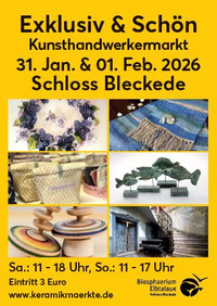 Exklusiv & Schön – der Kunsthandwerkermarkt im Schloss Bleckede, der am 31. Januar & 1. Februar 2026 stattfindet. Professionell arbeitende Künstler, Handwerker und Designer bieten Ihre Werke an. Handgefertigte Geschenke wie Schmuck, Damenmode oder modische Accessoires, Hüte, Taschen, Keramik, Holzskulpturen, Dekorationen für drinnen und draußen oder Grafiken gehören ebenso zum Angebot wie kulinarische Spezialitäten. Wer sich für altes Handwerk interessiert, modernes Design sowie hochwertige Materialien schätzt und regionale Produkte bevorzugt, darf einen Bummel über diesen wunderschönen Kunsthandwerkermarkt nicht verpassen.